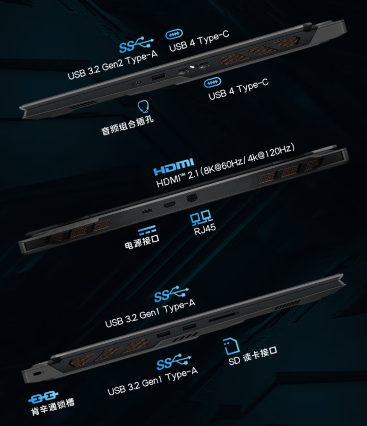 新款接口更加丰富,包含SD读卡器,2个USB-A3.2 Gen1,USB-A3.2 Gen2,2个USB4,HDMI2.1,RJ45,音频接口和电源插孔,3A2C且支持三屏输出四屏一显。