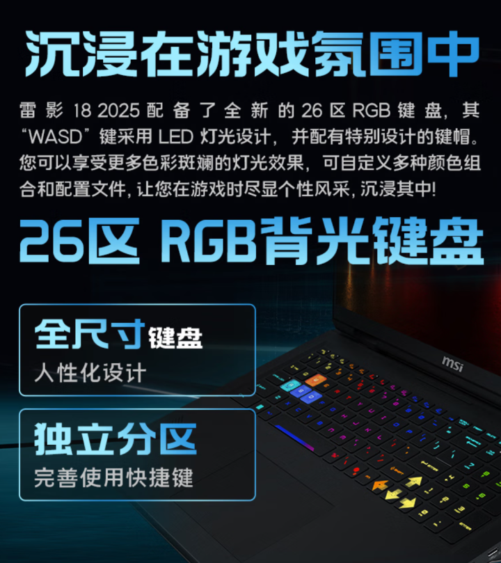 这款产品采用了金属材质机身,A面龙盾LOGO,转轴大幅前移,露出了很大的【屁股】,C面配备全尺寸键盘,支持26区RGB光效,其中WASD键采用LED灯光和透明键帽设计,方向键也是醒目的大箭头,辨识度很高。