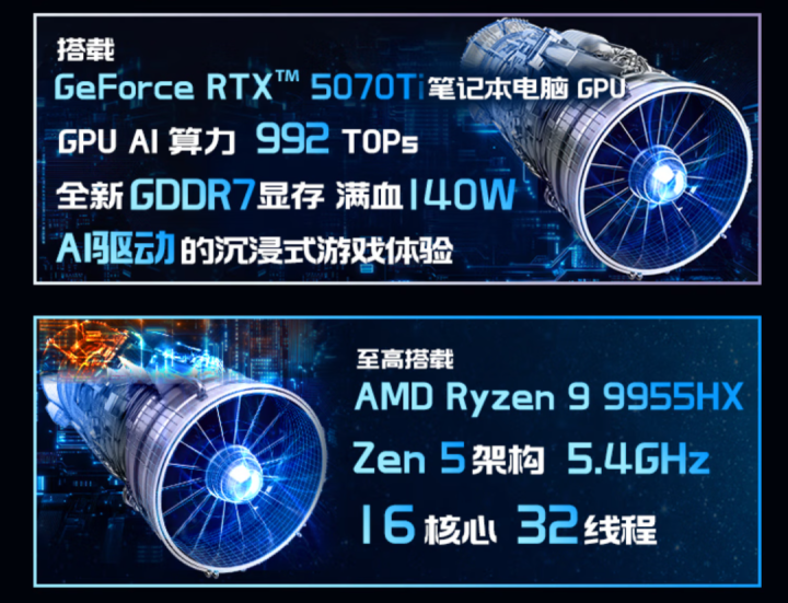 雷影18升级AMD全新一代的锐龙9 9955HX处理器,作为桌面端锐龙9 9950X的移动版,它采用了相同的16核心32线程,80MB总缓存,最高主频5.4GHz。可选175瓦满血版的RTX5080,或是140瓦满血版的RTX5070 Ti独显。